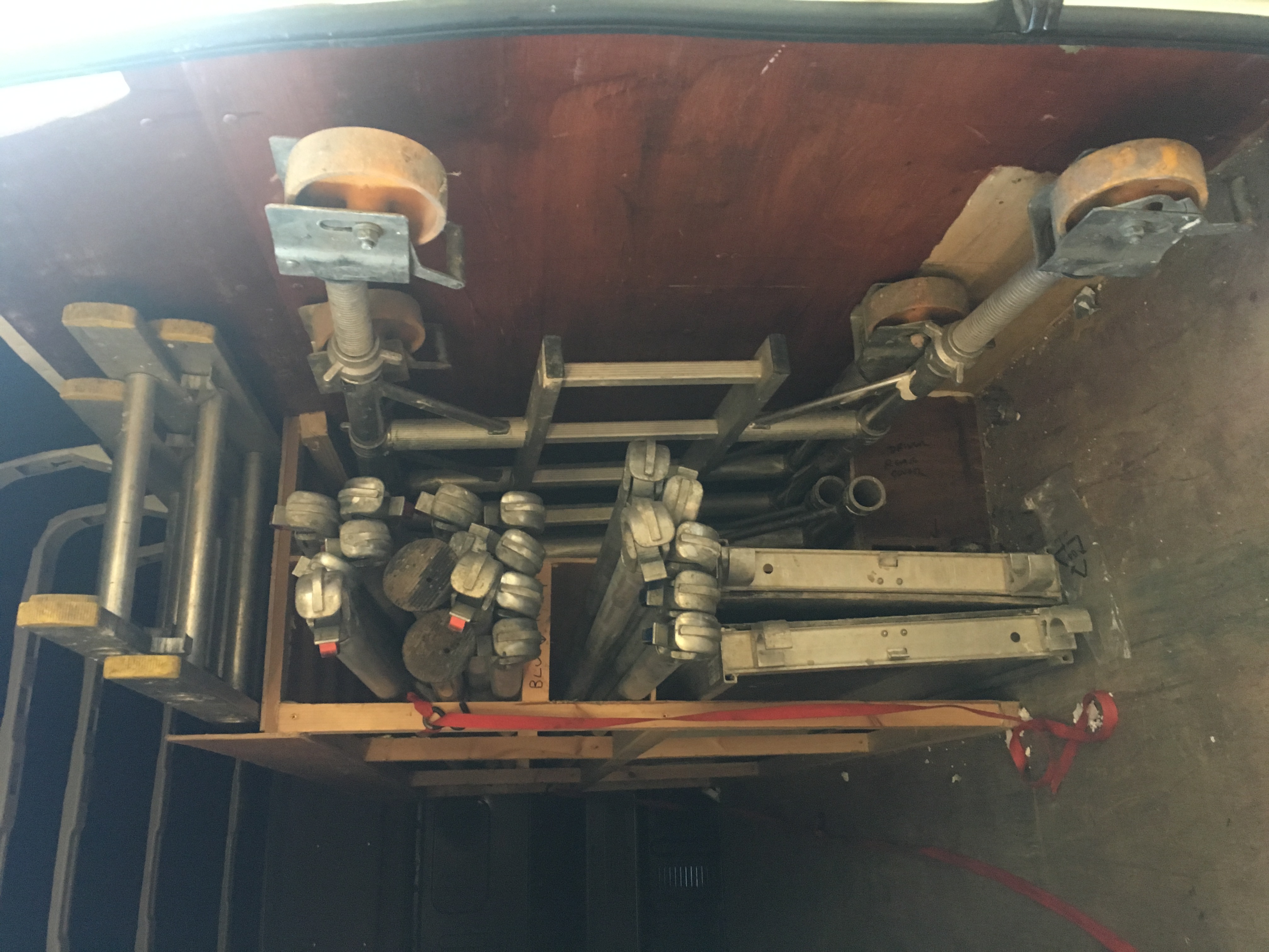 We carry 2.5 lifts of tower just slides in, held in place with narrow unistrut framework floor to roof with a high level shelf over the top. We also have a ladder rack attatched to the framework which holds triple ladder.