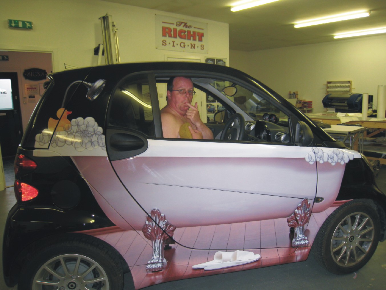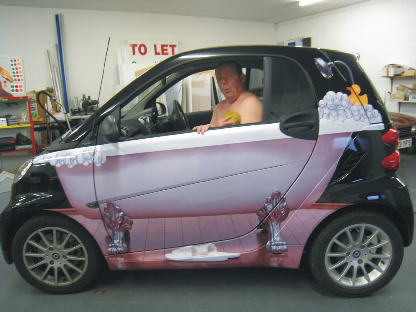 Posted by Phill Fenton on 13 May 2010 at 17:34One of my clients has a bathroom showroom and wanted a wrap done on a smart car to make it look like the driver was sitting in a bath.
