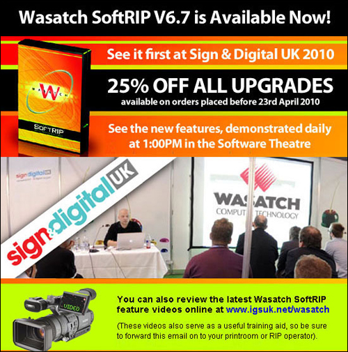 Distributed by IGS UK, at Sign UK the Wasatch upgrade promotional offer will be available from resellers:-