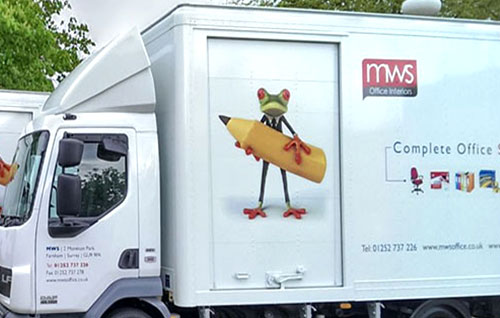 Weedoo Signs were tasked with incorporating new designs, which include an eye-catching frog mascot, onto two brand new 7.5-tonne and one 12-tonne DAF trucks. Colour illustrations and contact details were applied to the side panels and rear tailgate of all vehicles to raise brand awareness of MWS Office Supplies across the south eastern counties, including Surrey, Hampshire, West Sussex, Berkshire, Buckinghamshire, Middlesex, south London and the fringes of Dorset and Wiltshire. Based in Surrey, MWS Office Supplies provides a full range of office products for commercial businesses, local authorities, schools and colleges both locally and nationally. Established for 30 years, the company was subject to a management buy-out in 2010, which has seen an injection of new management, services and now the creation of a new corporate brand and design.