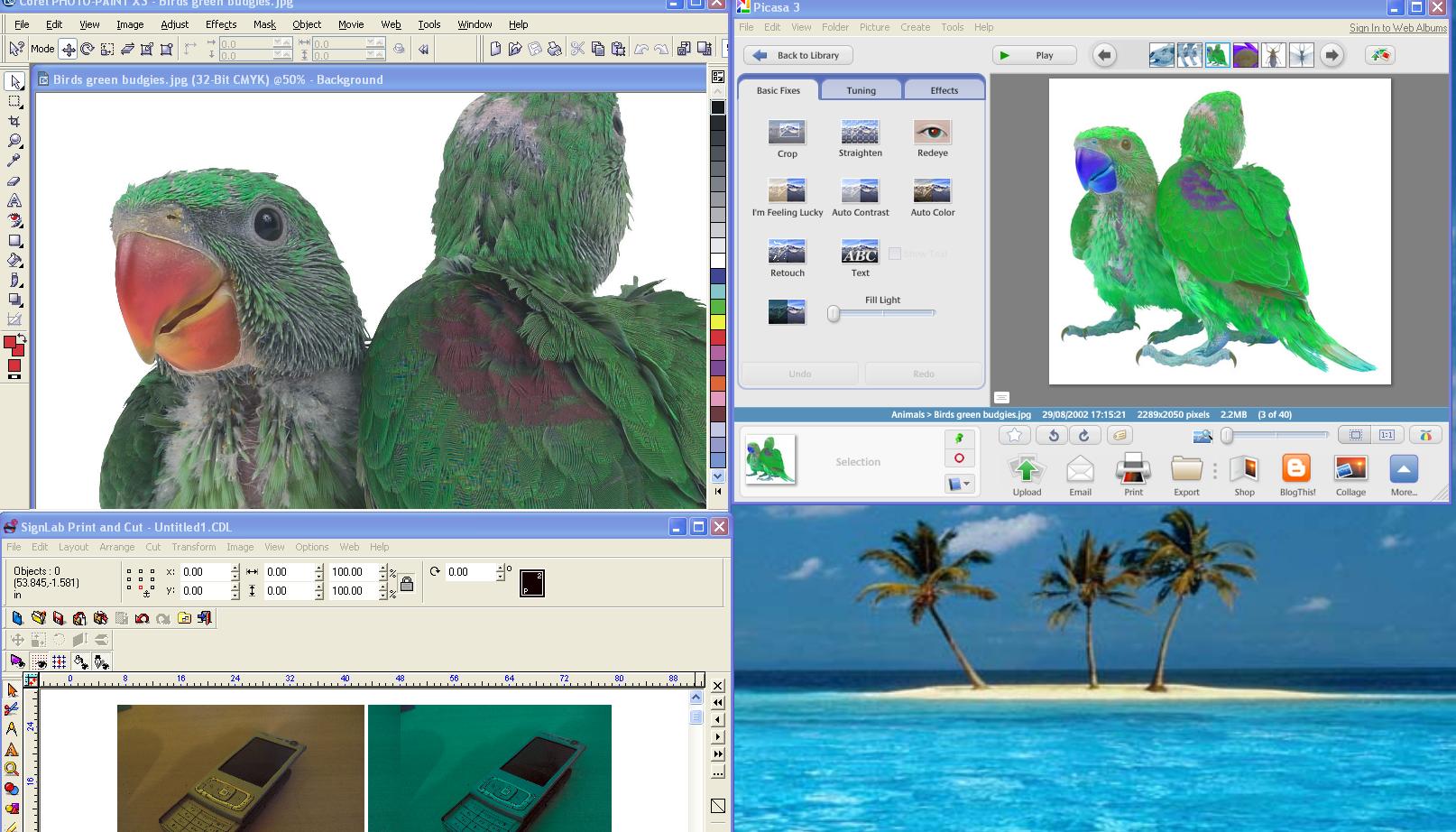 Posted by Peter Normington on 21 December 2008 at 10:29If I take a photo in tiff format, when I viewe/ open it the colours are almost but not quite reversed, attached is a screen shot of some stock photos that also do the same, but they are Jpg, in my picture browser the parrots are wrong but open in corel OK