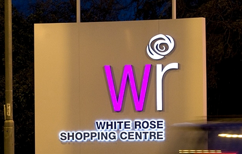 White Rose Shopping Centre is located on the south side of Leeds City Centre. The Centre’s owners Land Securities worked with design group Sixteen Hands to refresh the centre’s branding reflecting its stronger fashion focus. When they looked to update the Centre’s signage with the new branding, Wood&Wood were delighted to be appointed to manufacturer both the external and internal signage. As part of the external signage Wood&Wood created 4 post mounted signs located on each of the approaching roundabouts. Each sign is 3.7 metres high x 4.2 metres wide, manufactured from aluminium panels with the name of the shopping centre in built-up halo illuminated lettering.