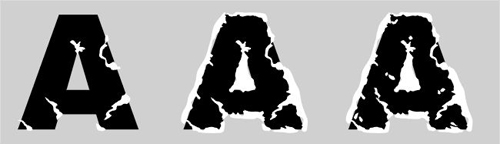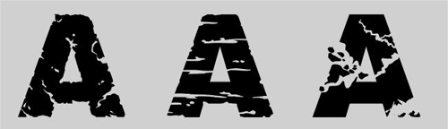 Here we see the result of our labour (below left) and it looks pretty convincing for all the right reasons. Remember that we read text by scanning familiar shapes and envelopes – not by interpreting individual characters. If we degrade these shapes too much then legibility suffers and the text is not easy to read. For this reason, do not erode the outer edges of the characters too much. There are various forms of erosion – sometimes it occurs by repeated abrasion from one direction and even from one side or angle (below centre). Some forms of erosion are severe (below right) and take the form of total fragmenting of part of the letter, various fissures and splits and maybe even large areas missing! Where the latter occurs – try to maintain the shape of the original character by leaving certain edge pieces…With only a little practice each letter can be completed in less than 30 seconds.