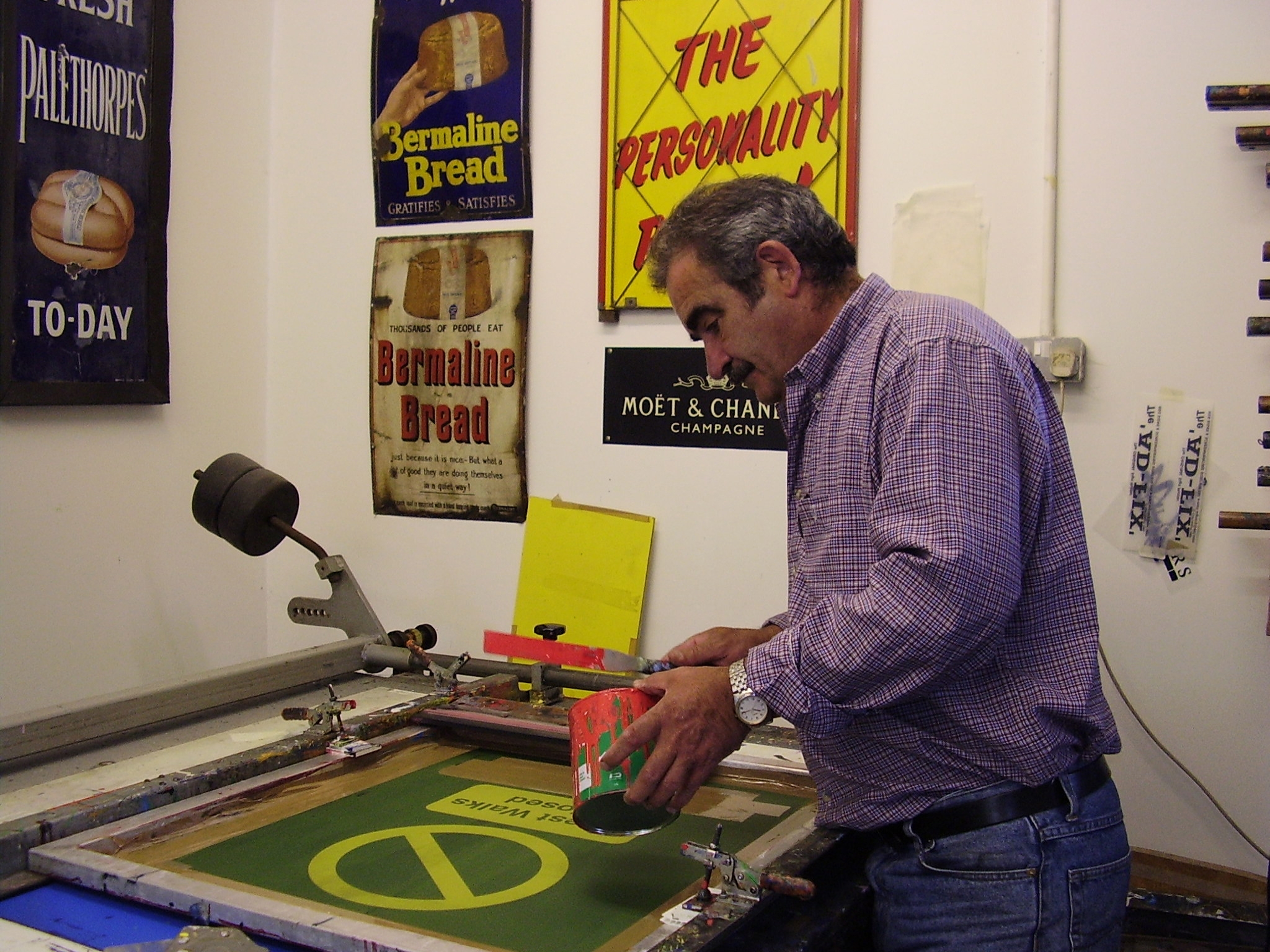 We also printed p.v.c covers (for the N.C.R.) printed in gold PVC ink, 6,000 on a Tuesday and 6,000 on Thursdays – a big job as before they were sewed to fit a cash register. The size of the bags was around 40”x 40” so you could imagine it was a large handling operation for the 3”x1” screen print in the centre. Another interesting job was the petrol pump plates, which were curved on the face, we had to make a curved screen to comply with the radius of the plate. This is why screen-printing is so fascinating you did not know what job was ahead of you. A customer asked for a print on the glass for ‘gaming machines’ (usually supplied by the gaming machine company). He was a local businessman and was getting charged a lot of money for getting prints 20 sets off with 4 colours, and reverse glass prints on his machines. We were able to do the job at a quarter of the price, which not only pleased the customer, but he asked why can you do it cheaper. Our answer. We had the time & the experience, but most of all the pleasure.